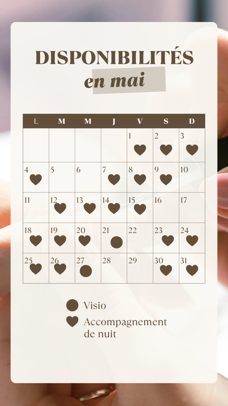 Informez-vous sur les horaires et jours où vous pouvez réserver une séance de soutien post partum sur cette page. Ces informations sont régulièrement mises à jour pour vous offrir la flexibilité nécessaire dans votre emploi du temps. je vous offres plusieurs créneaux horaires adaptés à vos besoins afin que vous puissiez bénéficier d'un soutien personnalisé tout au long de votre parcours post partum. N'hésitez pas à m'envoyer une demande via le formulaire ci-dessous pour choisir le moment qui vous convient le mieux.